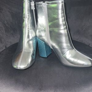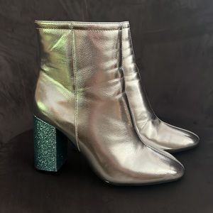 BNWT (in box) never worn silver metallic ankle boots with zipper. These have a stacked heel covered in aqua blue glitter. This is such a perfect boot for music festivals or pair with basics just for fun. Purchased multiple pairs for a photo shoot and never used the size 8. Will ship with or without box - buyers preference. Urban Outfitters