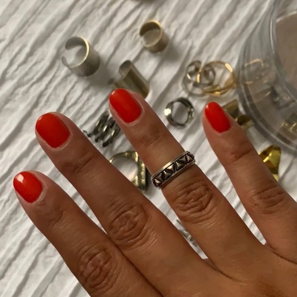 Hey... The ring I was talking about is the one to the right of your ring finger nail. Simple, plain, brass/gold, not bulky, wide band. Let me know!