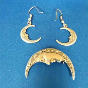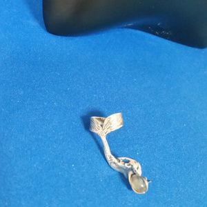 Silver moon earring pair with silver and marcasite moon pin; silver mermaid and moonstone earcuff with moonstone stud. These are really beautiful. The mermaid is holding a small moonstone stud and her tail is the cuff part. The other ear is a single moonstone stud. The earcuff could even be worn by a young girl as it is small in proportion. Of course it would fit an adult ear, but would not fit on the thick ear form above without bending the cuff.