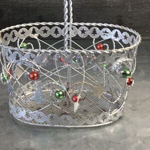 Xmas basket with a twisted style handle, stars and trees, with red and green beads for baubles. Tarnish to bottom and side, see pics. Measures 6 1/2” tall with handle, 5” long basket, 3 1/2” wide and 3 1/4” deep. Fairly good preowned condition. Weighs under 3oz.