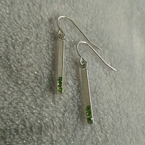 New and unworn! Sweet silver drop earrings with peridot-green-colored stones. Bars are 1" long, total earring length is 1.25" including the ear wires.