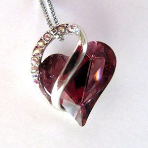 This piece is a real sparkler! Faceted foil backed deep pink rhinestone has a silver tone overlay encrusted with tiny aurora borealis stones. The pendant is just under 1" long and the box chain is 17" with a 2" extension. No designer markings, but very well made. Perfect, gift quality.