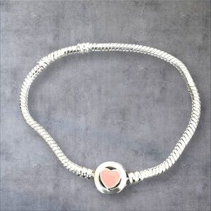 Silver plated bangle bracelet with enamel heart clasp, fits Pandora’s charms