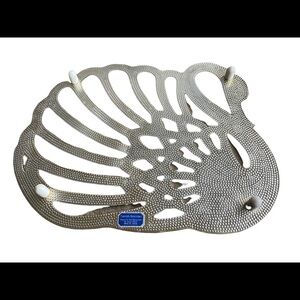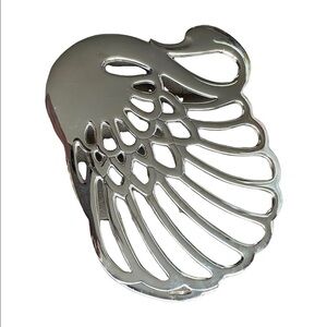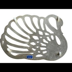 Like new swan cut-out trivet. I believe this is silver plated but I am not positive. I also believe this was produced by Wm Rogers company. It does note not to use silver polish, and it is tarnish resistant. Just wipe with soft damp cloth to clean. Four legs all covered with white protectors to protect your table surfaces. Made in Japan. This would be perfect for any holiday dinner to put the ham, casseroles or other hot dishes on your table!