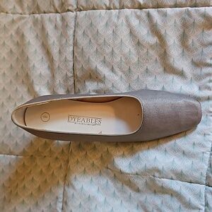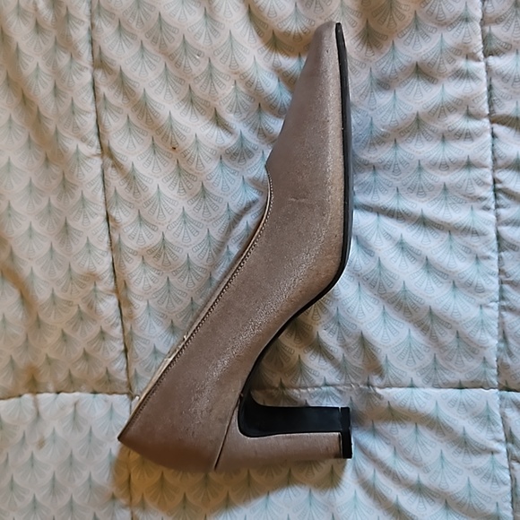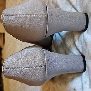 Silvery gray, slightly shiny fabric, mid-height heel pumps. Worn once, euc.