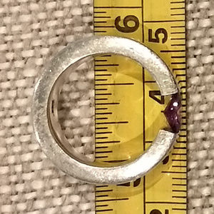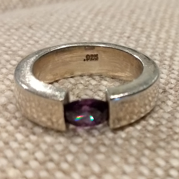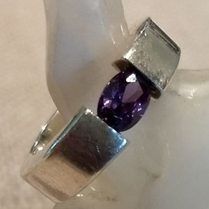 Silver ring with amethyst crystal (no natural) crystal long 1/4 in, silver 0.925 . Approximate ring size is number 7, it has 17.3 mm inside diameter. The ring is worn and shows several scratches of normal use.
