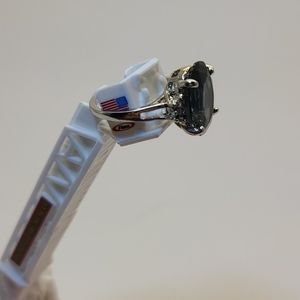 Silver ring with a large blue stone and three small stones on each side...firetruck not included :)