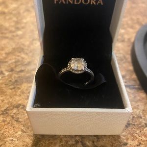 Silver “halo” ring size 7 from Pandora. Beautiful ring I just have too many lol.