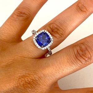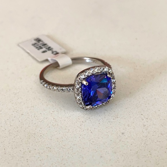 925 Sterling silver engagement ring with CZ and blue square center stone