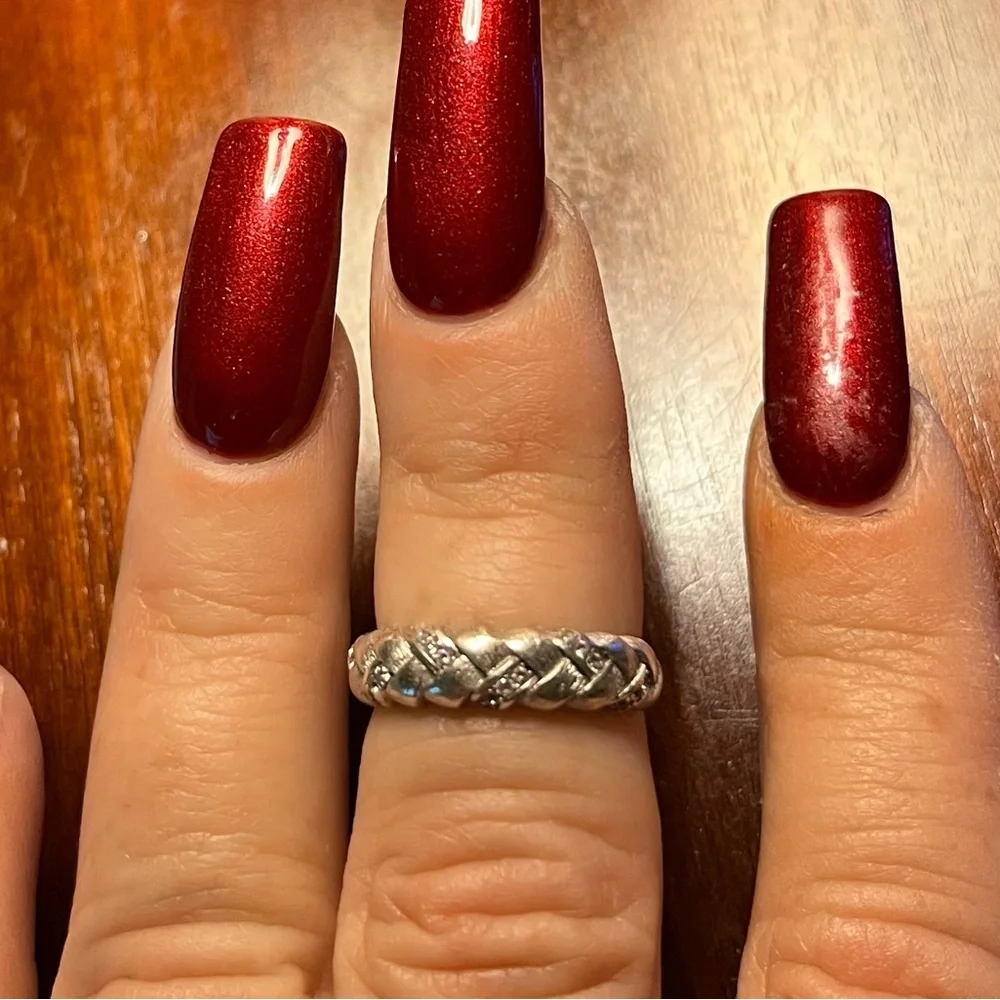 This gorgeous real silver ring, thickly braided with tiny cubic zirconia accents for sparkle. Doesn't spin around on your finger very sturdy one of my favorite rings size 7.