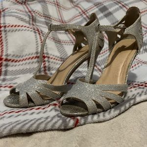 Silver sparkle heels, I believe they’re 3 inches. Size 7.5