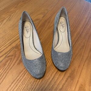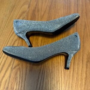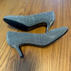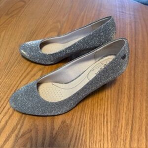 These are a like new pair of size 8 1/2 Lifestride silver glitter 2" slip on pumps with cushioned footbed. Depending upon the angle, sometimes the shoe appears to change to gold....but they are definitely silver. These retail at Kohls for $50. #lifestrideheels #silverheels #silverpumps #2inchheels #dressypumps #formalheels