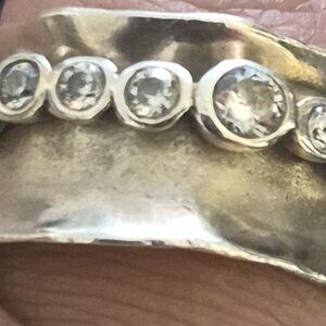 The Spin Me Around ring is a bold, handcrafted statement piece featuring a wide sterling silver band with a slightly hammered, organic finish. A row of sparkling bezel-set round stones wraps seamlessly around the band, giving the effect of continuous movement and radiance. The asymmetrical silver edges add a rustic, artisan touch while the polished bezels highlight the brilliance of each stone. Perfect for those who love jewelry that feels both modern and timeless, this ring is versatile enough to wear daily yet striking enough to stand out on special occasions.
