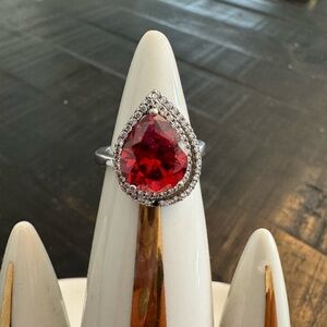 Ruby type teardrop ring with accent stones. Silver ring. Size 6.5. Please see all pics.