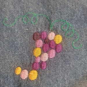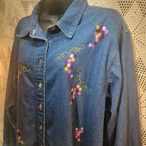 Silver thread XL Long sleeve button down denim looking top. different color buttons. embroidered grapes