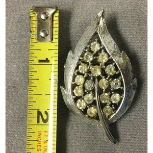 Silver tone Leaf Pin Clear Stones 2 1/4"x 1 1/4" Unbranded