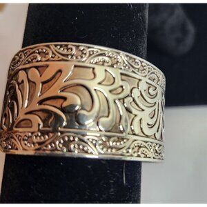This beautifully crafted silver tone cuff bracelet showcases intricate engraving work. The design is elegant and timeless, appealing to those who appreciate classic jewelry styles. The bracelet's open-ended cuff design allows for easy wear and adjustment.