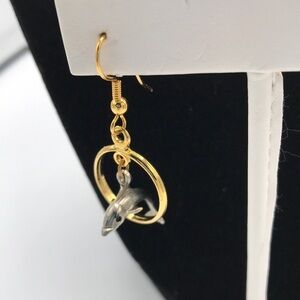 Silver tone dolphin jumping through a gold tone hoop ear wire earrings. Measures about 1 7/8” in total length, including ear wire. Hoop is 8/16” in diameter. Add a bit of movement to your look!
