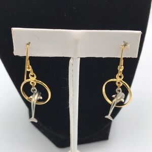 Silver tone dolphin jumping through gold tone hoop earrings