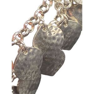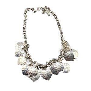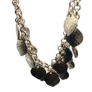 Silver tone double row hammered leaves on silver tone chain bib necklace