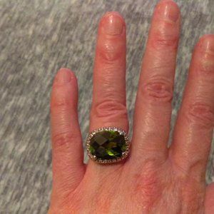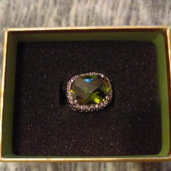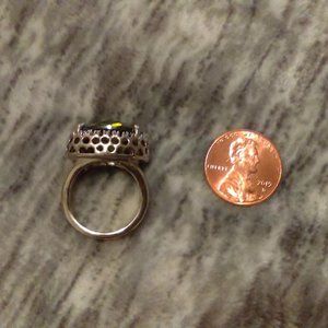 Silver tone ring with faceted green stone. Approximately size 6.