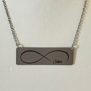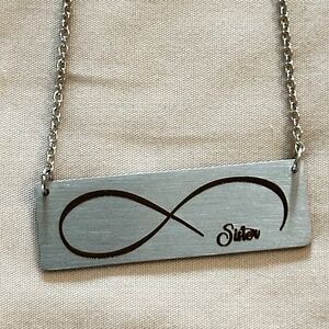 Silver tone rectangular plate on chain w/etched infinity symbol says “Sister”