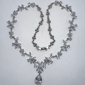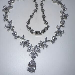 Excellent condition, no flaws. Necklace is embellished with dozens of beautifully reflective prong-set cubic zirconia in an array of sizes and shapes with large single hanging teardrop front and center. Wearable length is 17" with the option to shorten by approx. 0.75" thanks to the additional clasp. Please see photos for drop measurements in inches.