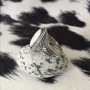 Silver detailing statement ring with white center stone.