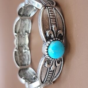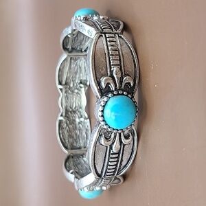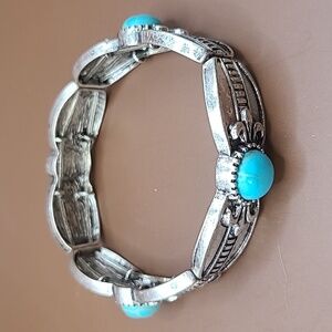 Silver tone stretch bracelet. With faux turquoise. Pre-owned condition. No maker's mark.