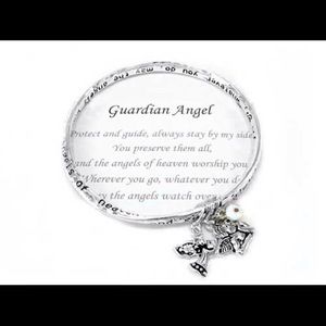 Designer-style 1/4" wide silvertone twisted mobius bangle bracelet with 1/8" to 1/2" angel and mustard seed charms and a "Guardian Angel" inscription.