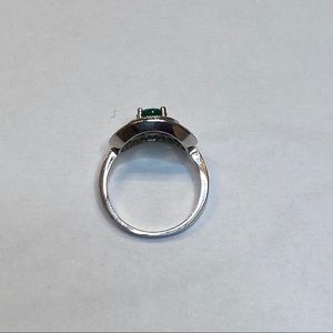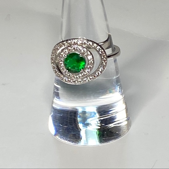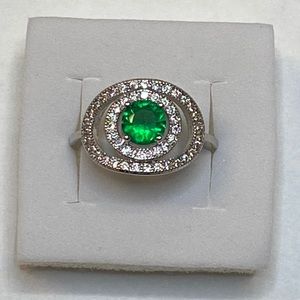 One emerald green stone surrounded by two rings of clear stones. Silver toned band