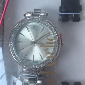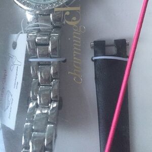 Convertible watch! Wear it as a silver band or change it out to black leather. Very cute and versatile. Brand new in box.