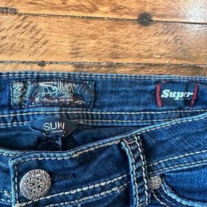 Silver western, distressed, Suki, cowboycore, normcore, super skinny jeans. Pairs well with a button down shirt or basic tee. Approximately 8 inch rise. In good, used condition. From a pet and smoke free house. Happy to bundle!