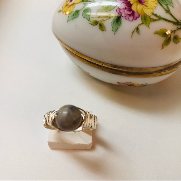 Silver wire wrapped ring with two tone gray ceramic bead.