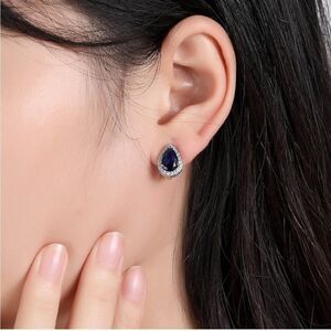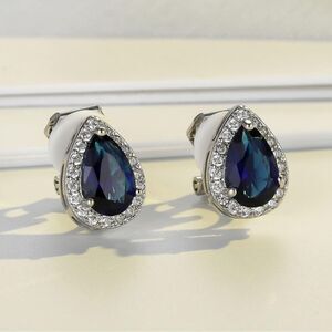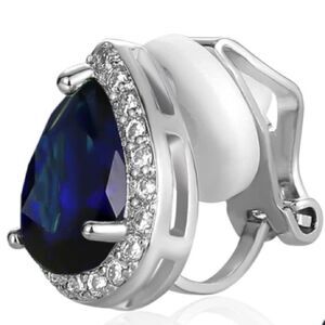 Silver Tone Teardrop Shaped Comfortable Cushioned Clip On Stud Earrings Embellished with Round and Teardrop Cut Deep Blue Sapphire and White Diamond Cubic Zirconia CZ
