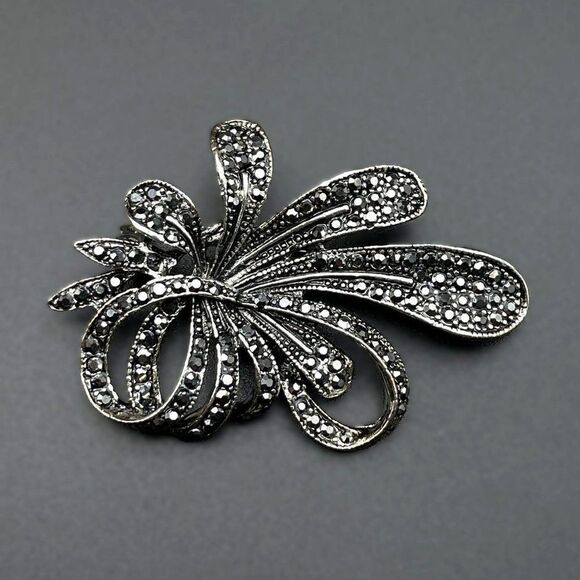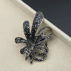 Silver Tone Floral Flower Ribbon Bow Pin Back Brooch Embellished with with Dark Grey Crystals