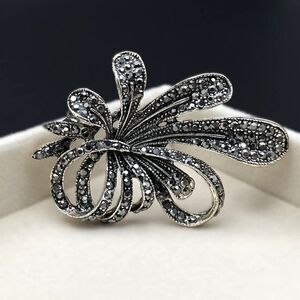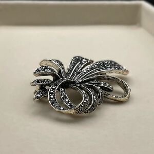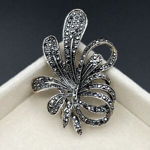 Silver with Dark Gray Crystal Floral Flower Ribbon Pin Back Brooch