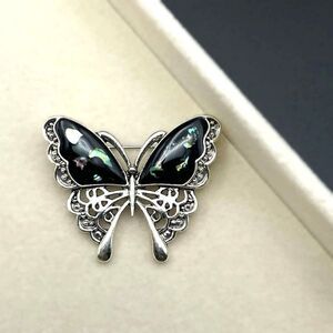 Silver with Embedded Shell and Black Enamel Butterfly Pin Back Brooch