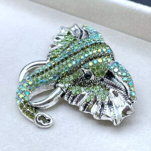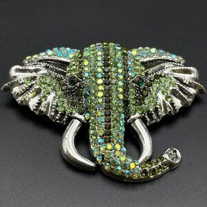 SIlver Tone Tusked Elephant Head Pin Back Brooch Embellished with Emerald Green, Green Peridot and Green AB (Aurora Borealis) Crystals