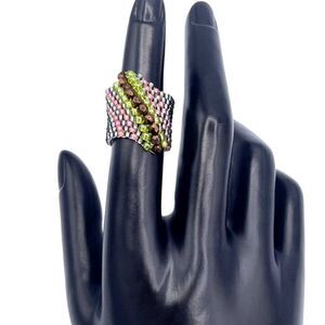 Brand New - Handmade Form Fitting Beaded and Crystal Flat Cellini Spiral Peyote Statement Ring