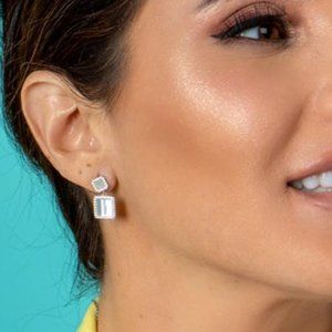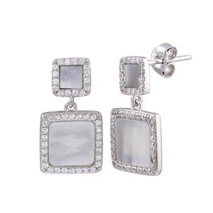 Silver 925 Rhodium Plated Dangling Square Mother of Pearl CZ Earrings