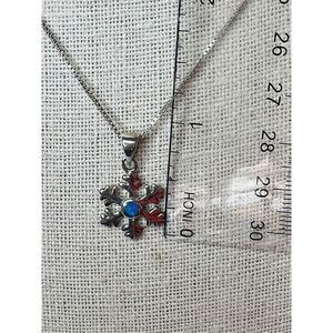NWOT Silver 925 Simulated Fire Opal Snowflake Necklace + Drop Earring Set Jewelry. Beautiful simulated fire opal enchanting snowflake design worth matching earrings. Necklace length is approximately 18". Snowflake including bail is approximately 1" by 1/2". Earrings drop length 1 3/8". Chain type: Box. Item in NEW condition. No known rips, tears, holes, stains or defects. Stamped 925 sterling silver. See photos.
