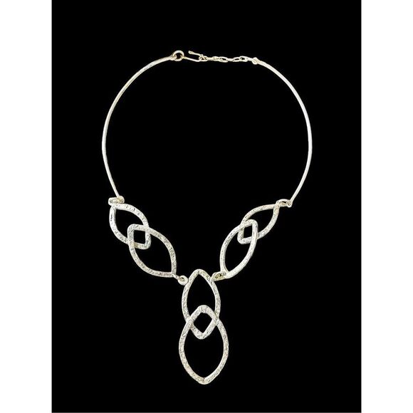 Gorgeous Handcrafted Handmade Artisan Geometric Necklace. Measures 10” from clasp to bottom piece. Purchased a long time ago at a craft show and unsure of the artist but it is one of a kind and unique!! Hammered silver gives it an interesting texture and it wears like a choker but it’s longer and not as tight as a traditional choker necklace. Bohemian Artsy Necklace. Makes a great gift!! No markings that I can see but that just means it’s hand done and this is the ONLY ONE I can find. Tried to research And was unable to find another one like it on the web!!