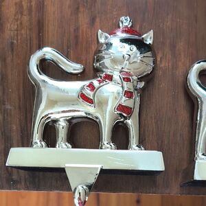 Set of two silver cat stocking holders with red glitter accents on their hats and striped scarves. Perfect for a cat lovers holiday decor.