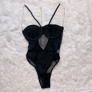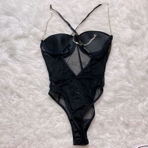 Flaunt your curves in this bodysuit featuring a sheer mesh body with silver chain details, adjustable spaghetti straps and a thong cut back.