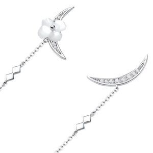 Crescents decorated with pure clear zircon and pearl flower. Tassel design with falling petals at the ends finishing this fine jewelry masterpiece.