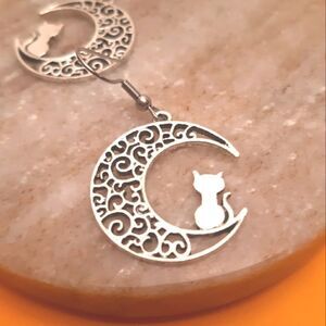 Silver Crescent Moon Kitty Cat Stainless Steel Hook Earrings