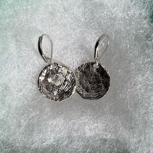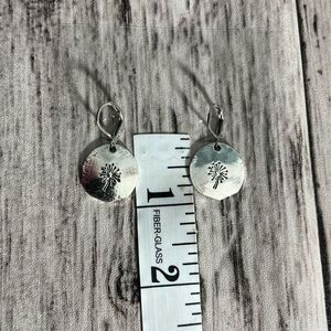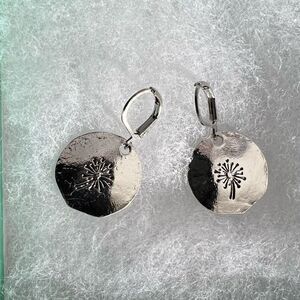 Delicate silver-tone dangle earrings featuring a hammered round disc design with a hand-stamped dandelion motif. Lightweight and easy to wear with secure leverback closures. Perfect for adding a touch of charm and shine to any casual or dressy outfit.