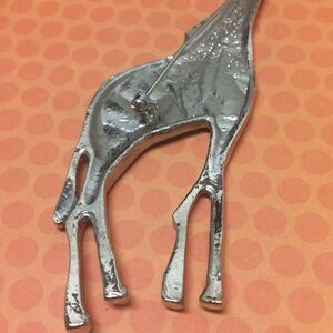Cute Giraffe pendant is silver with black specs. Tiny turquoise blue stones in eyes. Pendant is 4 1/2” in length. The widest part is 1 1/4”. Pin on back is 2”. Nice weight.