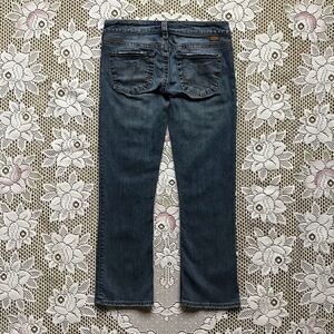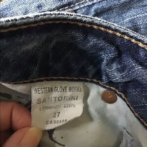 Light wash low rise crop with 5 pocket design button zip fly. Distressed waist, pockets and hem. There are a few broken stitches on pockets and small yellow satins. Please see pictures provided.